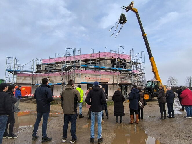 Und der Nikolaus hatte einige Daten im Gepäck. So soll in diesem architektonisch interessanten Gebäude, in dem zukünftig bis zu 96 Kinder tagsüber betreut werden können, schon im kommenden Herbst das kunterbunte Leben Einzug halten.