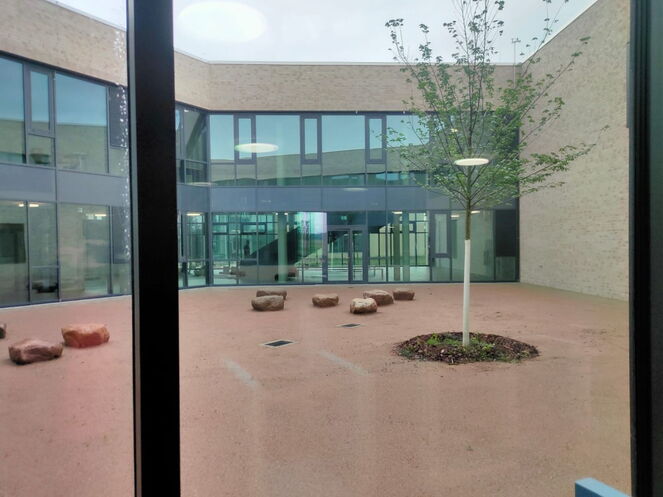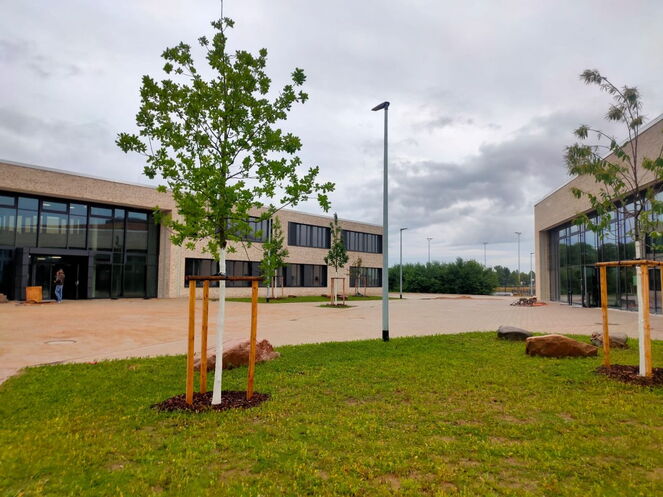 In den Außenanlagen wurden die Pflasterarbeiten abgeschlossen. Die Zaunanlagen im Bereich Schulhof Grundschule/Hort, Kleinspielfeld und Regenrückhaltebecken wurden eingebaut. Die Gehölz- und Rasenflächen wurden weitestgehend fertiggestellt. Aufgrund der letzten Starkregenereignisse sind Ansaaten im Bereich von Böschungen abgeschwemmt worden und müssen nachgearbeitet werden.