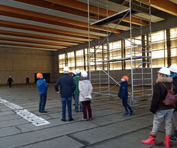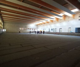 Das Dach der Zweifeldsporthalle mit Mensa wurde fertiggestellt, lediglich Pflanzsubstrat und Ansaat fehlen noch. Im Bereich der Gebäudefassaden haben die Arbeiten der Vormauerklinkerung, im Bereich der Pfostenriegelfassade hat die Verglasung begonnen. Die Haustechnikgewerke Heizung/Lüftung/ Sanitär haben bereits einen großen Teil ihrer Rohinstallationen durchgeführt, zurzeit werden die Heiz- und Lüftungszentralen im Obergeschoss hergestellt. Die Trockenbau- und Estricharbeiten sind in vollem Gang.