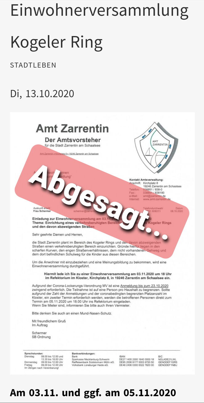 Am 03.11. und ggf. am 05.11.2020 lädt die Stadt Zarrentin zur Eigentümerversammlung in das Kloster Zarrentiner ein. Thema: Einrichtung eines verkehrsberuhigten Bereichs im Bereich des Kogeler Rings und den abgezweigenden Straßen.