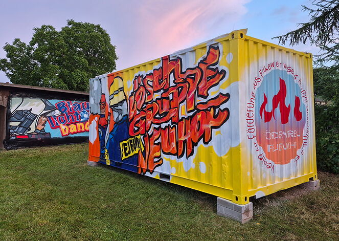 Gestaltet wurden kleine Universen auf Keilrahmen und auf großen Leinwandbannern und dem Container die Bilder der Kinder- und Jugendfeuerwehr, der Einsatzabteilung sowie des Feuerwehrfördervereins. Zusammen mit den Eltern versorgte der Förderverein die hungrigen Aktiven an diesem Tag. Interessierte schauten gerne mehrmals am Tag vorbei – keiner konnte loslassen. Jeder war sehr gespannt, wie sich die Bilder weiterentwickeln, wie die Kinder eifrig bei der Sache sind und wie Goran den Feinschliff aus dem Handgelenk zauberte.