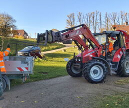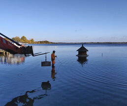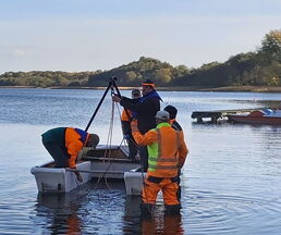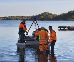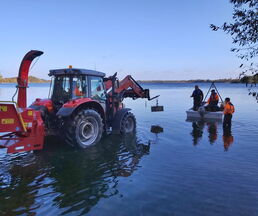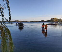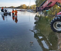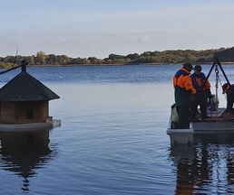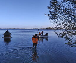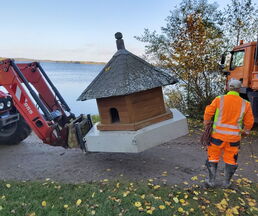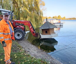Torsten Engel, Chef vom örtlichen Bauhof hatte mit seinen Kollegen, Klaus-Dieter Widmer, Monty Schlutt und Rene Brudnikow alle Hände voll zu tun. Der Radlader transportierte das Häuschen ins flache Ufer und die Ranger des Biosphärenreservatsamt Schaalsee-Elbe befestigten das Schwimmhaus am Grund.
