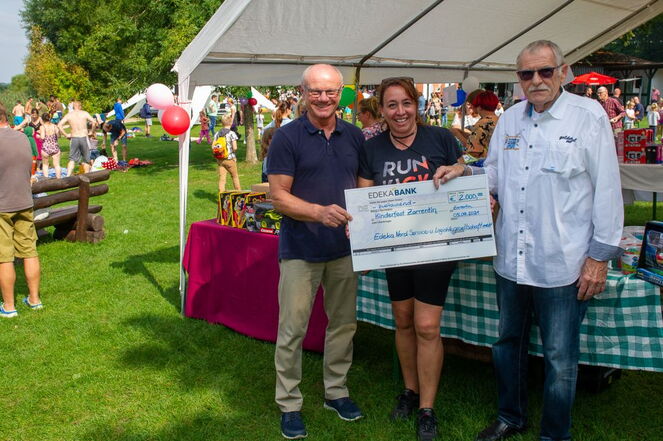 EDEKA Nord Service- und Logistikgesellschaft mbH unterstütze das Fest mit 2000,00 € für die Kindertombola und für tolle Kita Präsente. Die Firma Jysk, ehemals Dänisches Bettenlager, finanzierte die Sieger-Medaillen für die Kinder. Im Ziel beglückwünschten Antonia Bischoff und Marcel Rosemann vom Jugendparlament die kleinen Sportler.