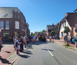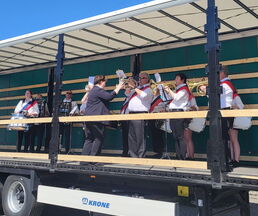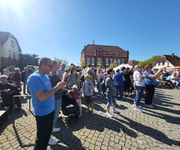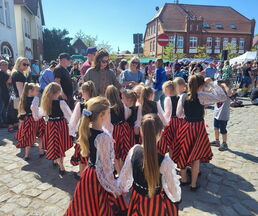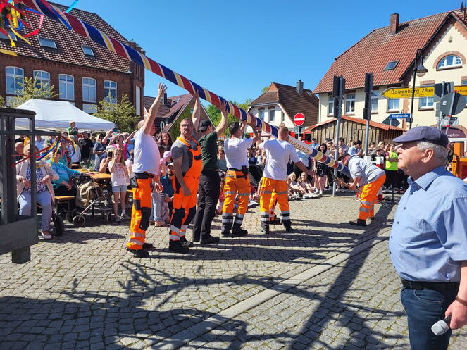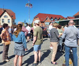 Nach kurzer Begrüßung von Bürgermeister Klaus Draeger kam der Bauhof mit schwerem Geschütz zum Einsatz und fixierte den bunt geschmückten Maibaum auf dem Markplatz. Der Wittenburger Fanfarenzug krönte den Festakt mit einem Trommelwirbel.