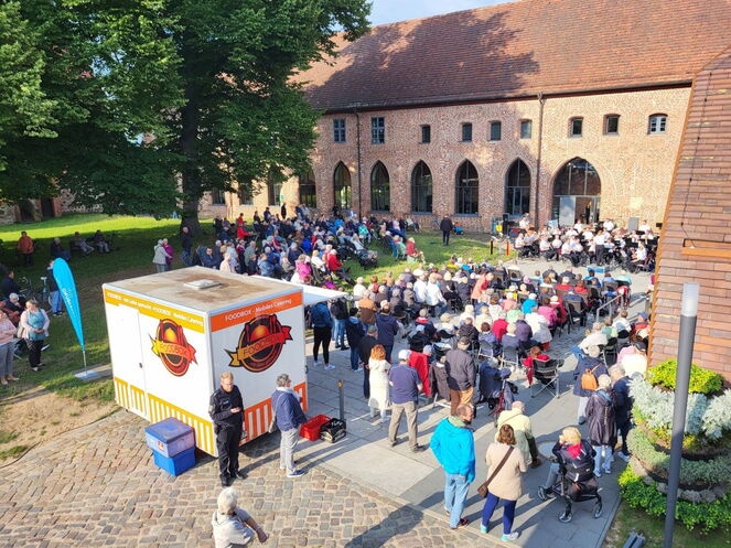 50 Musikanten formierten sich vor dem Eingang der Klosteranlage in windgeschützter Richtung. Das Wetter machte den Auftritt leider zu einer harten Probe.