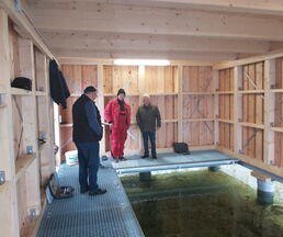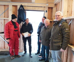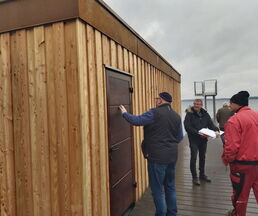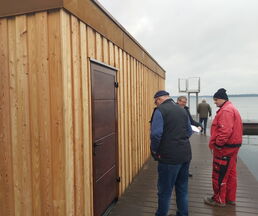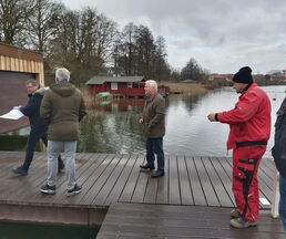 Bürgermeister Klaus Draeger, Heiko Frank vom Amt Zarrentin, verantwortlich für die Objektverwaltung, Dirk Fuhrer DLRG Vorsitzender und die Baufirma begutachteten das Werk.