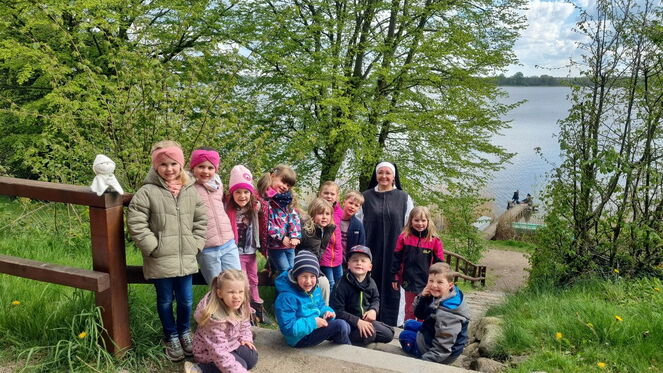 An der Teufelsstatue lauschten die Kinder der Erzählung von der Nonne und dem Teufel und warum die Maräne im Schaalsee gelandet ist. Dies können Sie übrigens auch nachlesen. In der Bibliothek liegen Postkarten mit der Sage aus. Außerdem wurden Fische gesammelt, Maränen gemalt und das Kloster besichtigt.