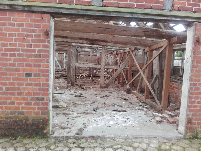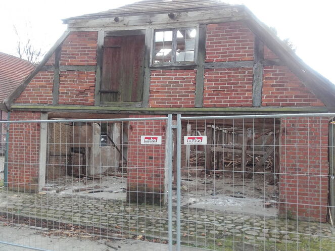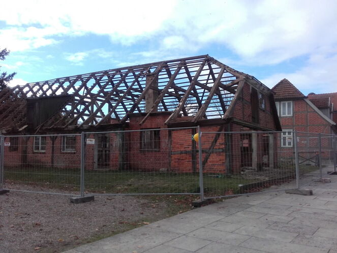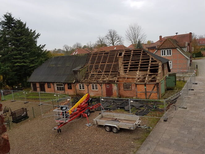 Fast liebevoll begannen die Bauleute, am Freitag früh, mit Hebebühne und Kran die noch erhaltenen Einzelteile der alten Amtsscheune zu bergen.