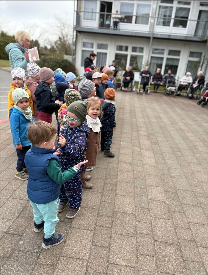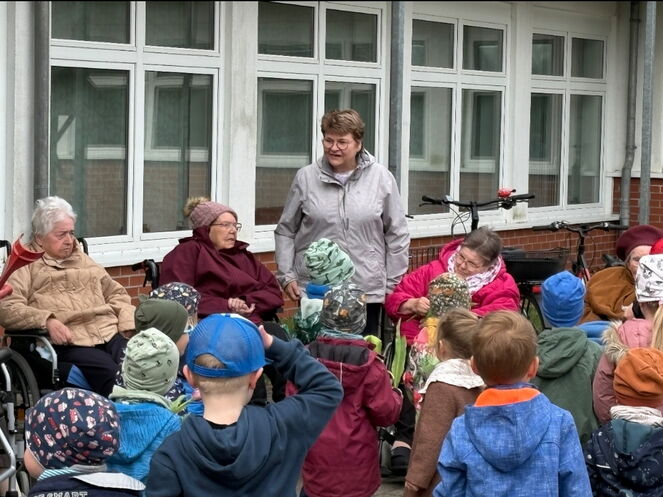 Die Kinder stellten den Heimbewohnern das im Tagesablauf erlernte Gedicht und Bewegungsspiel sowie Lieder zur Osterzeit vor und sorgten so für freudige Gesichter.