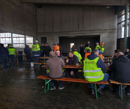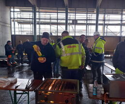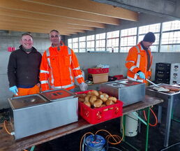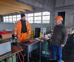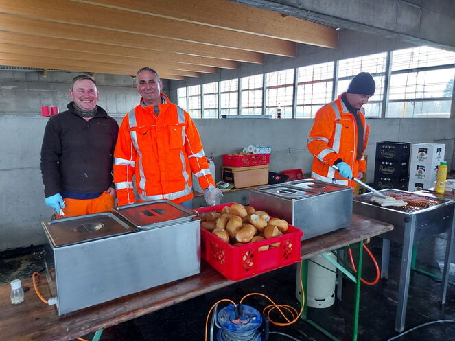 Zum Mittag eine frisch gegrillte Bratwurst, was für eine schöne Idee von Bürgermeister Klaus Draeger. Die Feuerwehr war sofort zur Stelle und brachte das Equipment vorbei und Torsten Engel vom Zarrentiner Bauhof, schwang mit zwei Kollegen die Grillzange, um die rund 80 Bauleute zu versorgen.