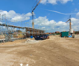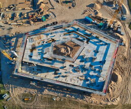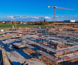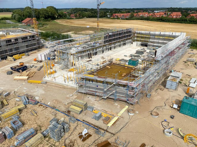 Die Grundschule/Hort wächst Zusehens empor. Das EG hat bereits zu 100% seine Betondecke erhalten und im OG werden Innen- und Außenwände errichtet.