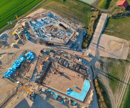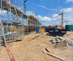 Die Regionale Schule ist rohbauseitig fertiggestellt, das letzte Drittel des Daches wurde am 21.09.21 betoniert. Ab dem 28.09. werden die Decken-Absteifungen im Bereich Foyer und in dem sich anschließenden ersten Drittels des Gebäudes (ausgehend vom Foyer entgegen dem Uhrzeigersinn) entfernt. Ab dem 04.10. beginnen die Abdichtungsarbeiten der Betonrohdecke im EG, sodass der Aufbau der Pfostenriegelfassade des Foyers unmittelbar nachfolgend beginnen kann; parallel werden im EG und OG die Fenster eingebaut und der Verblendklinker der Fassade weiter aufgemauert. Bei Einhaltung des straffen Terminplanes, wird die äußere Hülle des Gebäudes bis zum 18.10. vollständig geschlossen sein, der Startschuss für die Haustechnikgewerke mit ihren Rohinstallationen zu beginnen.
