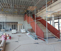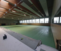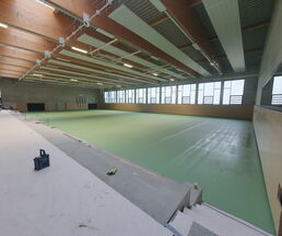 In der Zweifeldsporthalle ist durch einen Wasserschaden die Fertigstellung des Hallenbodens stark verzögert. Die Elektro- und Sanitärfeininstallationen kommen hingegen gut voran.