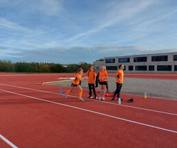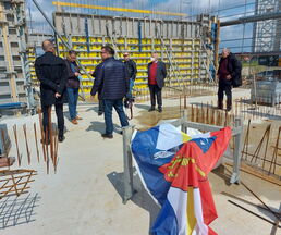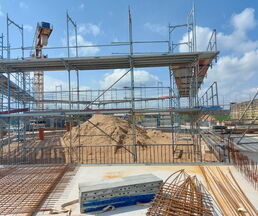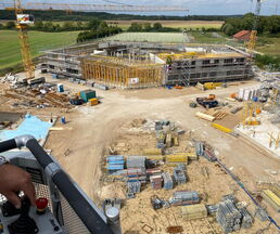 Die Zweifeldsporthalle mit Mensa hat zwischenzeitlich einen Dachstuhl erhalten, aus Leimholzbinder-Trägern in Breiten bis zu 0,60 m, Höhen bis 1,50 m und Längen bis zu 32 Metern. Die Schal- und Bewehrungsarbeiten der übrigen Dachflächen haben begonnen. Ziel ist es, die äußere Hülle des Gebäudes bis Anfang November ebenfalls zu schließen, damit ein Winterausbau im Innern des Gebäudes möglich ist.