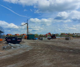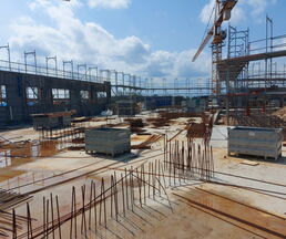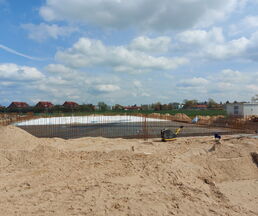 Die Fundamentplatte der Grundschule/Hort wurde mittlerweile komplettiert; mit den Schal- und Armierungsarbeiten der aufgehenden Stahlbetonwände wurde begonnen.