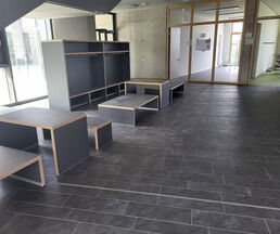 In der Regionalen Schule ist der Einbau ortsfesten Möblierung, Schränke in den Klassenräumen, Sitzmöblierung in den Freilernzonen im Obergeschoss und Garderoben auf den Fluren bereits gut vorangekommen, ebenso die Feininstallationen der Haustechnikgewerke. Die Bodenbelagsarbeiten mit Linoleum haben sich weiter verzögert und die Malerarbeiten sind bereichsweise noch immer nicht fertiggestellt. In der Zweifeldsporthalle sind die Elektroinstallationen weit gediehen, die Fliesenarbeiten und der Einbau der Sportgeräteunterkonstruktionen an der Sporthallendecke sind abgeschlossen. In der Sporthalle hat der Einbau der Prallwand begonnen. In der Grundschule ist der Einbau der Wandfliesen in vollem Gang, der Trockenbauer hat mit der Unterkonstruktion der Abhangdecken begonnen, die Malerarbeiten sind zum Stillstand gekommen.