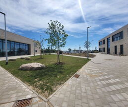 In den Außenanlagen wurde der Wiedereinbau des vor Baubeginn flächig abgeschobenen Oberbodens aufgrund der Witterungsverhältnisse Ende Dezember/Anfang Januar unterbrochen. Insbesondere die anhaltenden Regenfälle haben eine Wiederaufnahme der Arbeiten lange verzögert. Die bis Jahresende 2022 vorgesehenen Baum- und Gehölzpflanzungen konnten nicht vollendet werden und werden nun nachgeholt. Das Kleinspielfeld hat seine Tore und Basketballkörbe erhalten und die Flutlichtanlage wurde installiert. Ein Großteil der Pflasterflächen wurde im Oberbau fertiggestellt, so dass die Pflasterarbeiten zeitnah beginnen können.