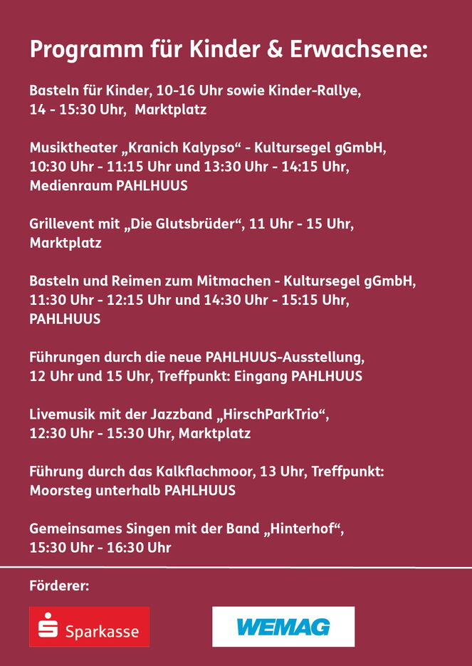 Zu den Aktionen gehören u.a. ein Grillevent mit den Glutsbrüdern aus Valluhn, das Musiktheater „Kranich Kalypso“, Führungen durch die wiedereröffnete PAHLHUUS-Ausstellung und durchs Moor, ein Programm für Kinder, Livemusik mit dem HirschParkTrio und ein Abschlusssingen. Der Biosphäre-Schaalsee-Markt hat von 10-16 Uhr geöffnet. Veranstalter des Marktes ist der Förderverein Biosphäre Schaalsee e.V. in Kooperation mit dem Biosphärenreservatsamt Schaalsee-Elbe und mit freundlicher Unterstützung der Sparkasse Mecklenburg-Schwerin, der WEMAG, des Amtes Zarrentin, der riha WeserGold Getränke Betriebsstätte Dodow und des Lebenshilfewerkes Hagenow.