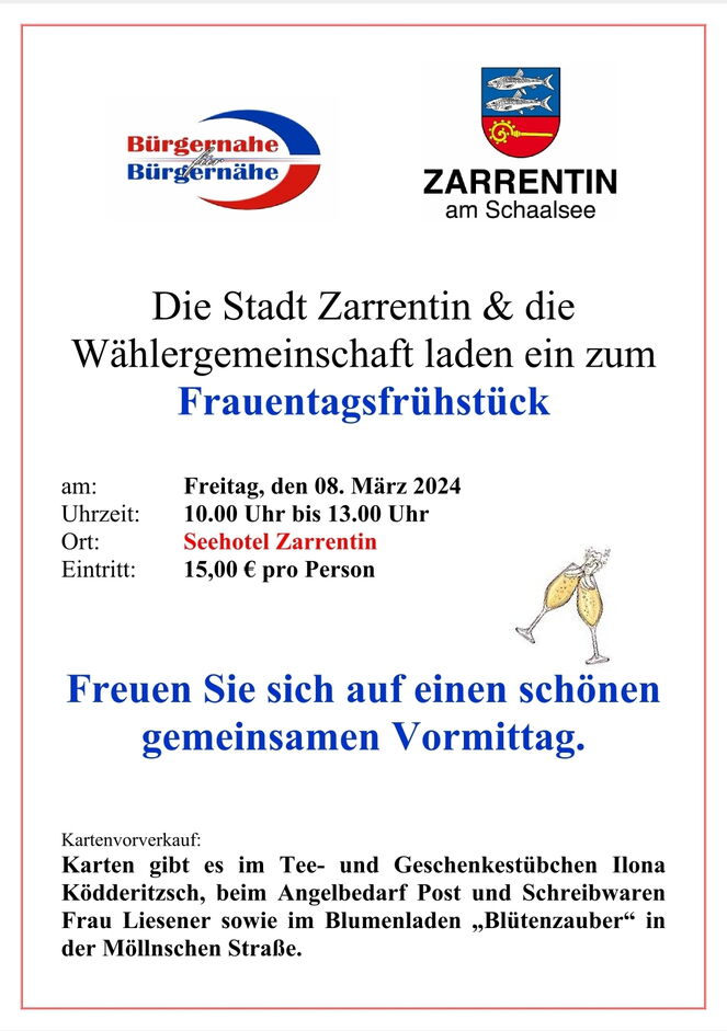 Frühstück für alle Damen im Seehotel. Karten für 15,00€ gibt es noch bei der Postfilliale und dem Blütenzauber in der Möllnschenstraße.
