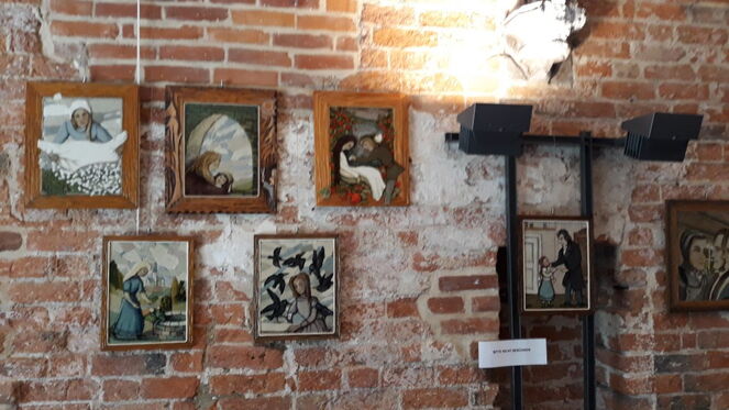 Gelegte Kunst aus Teppich Mosaik geklebte Motive aus der Märchenwelt, kirchliche Motive und bedeutende Gebäude sind in der Ausstellung zu den Öffnungszeiten des Kloster bis zum 11. November zu bewundern.