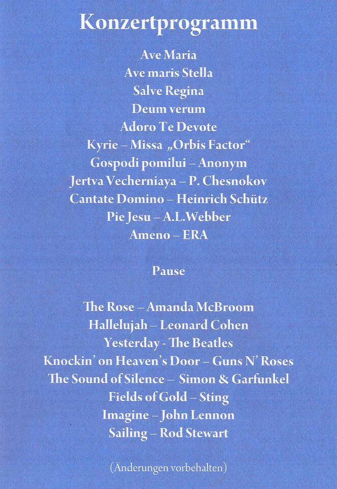 Im Stil des gregorianischen Gesangs neu arrangiert schweben Leonard Cohens „Hallelujah“, „You raise me up“ (Josh Groban),, „The Sound of Silence“ von Simon & Garfunkel, „Pie Jesu“ von Andrew Lloyd Webber oder „Amazing Grace“ durch den Raum. Popmusik für die Ewigkeit.