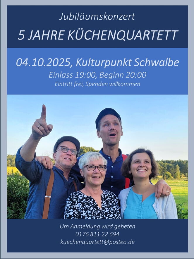 Am 4. Oktober feiert das Küchenquartett sein 5-jähriges Jubiläum mit einem besonderen Konzert im Kulturpunkt Schwalbe in der Amtsstraße.