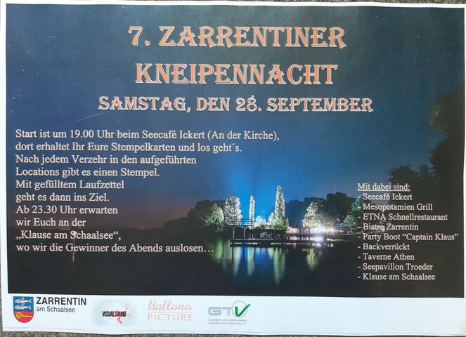 Ab 19 Uhr kann in einer der untenstehenden Gaststätten, Kneipen und Bistros begonnen werden. Stempelkarten liegen in allen Kneipen aus. Dann werden alle gastronomischen Einrichtungen bis 23 Uhr besucht und mit einem Stempel nach dem Verzehr eines Getränkes belohnt. In der „Klause am Schaalsee“ am Badestrand werden alle gestempelten Karten entgegengenommen, um an der Verlosung von tollen Preisen um 23 Uhr teilzunehmen.