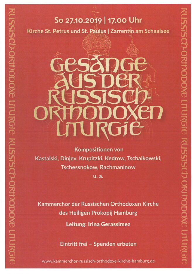 Die Lieder aus dem traditionellen orthodoxen Gottesdienst sind Musikstücke von außergewöhnlicher Schönheit und Tiefe. Auf dem Programm stehen Werke u.a. von Kedrow, Kastalski, Tschaikowskij, Rachmaninow. Das Konzert ist bei freiem Eintritt, Spenden sind erbeten.