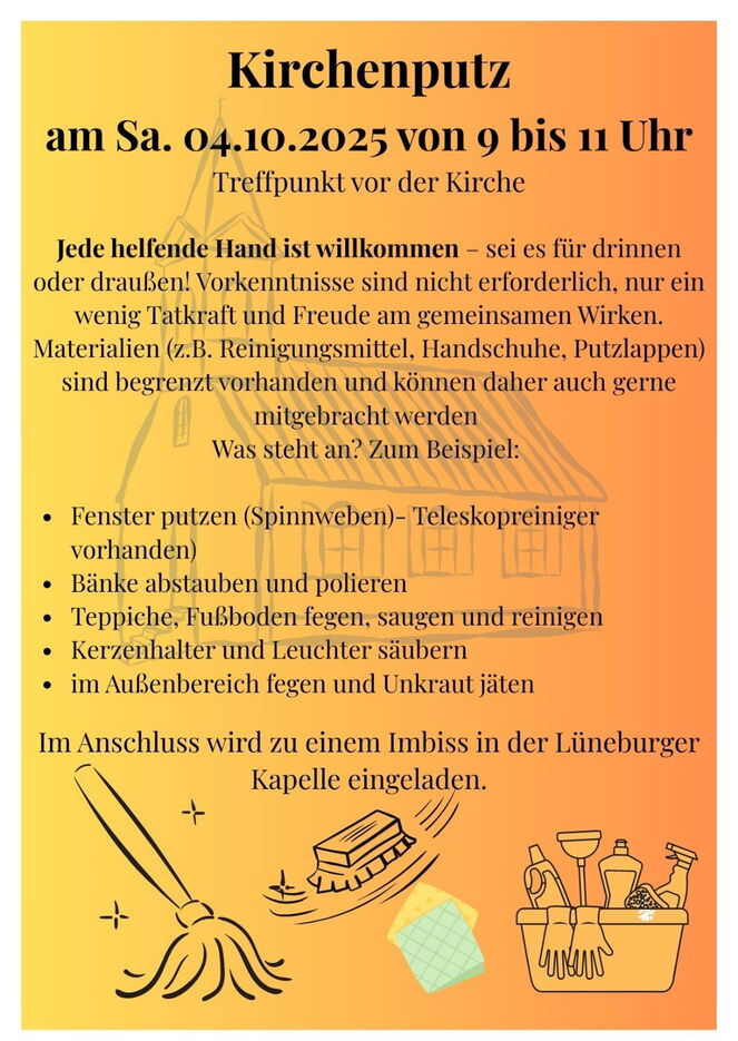 Am 4.10.2025 findet der Kirchenputz statt. Jede helfende Hand ist herzlich willkommen, um gemeinsam im Innen- und Außenbereich der Kirche für Sauberkeit zu sorgen. Reinigungsmaterialien sind begrenzt vorhanden und können auch gerne mitgebracht werden.