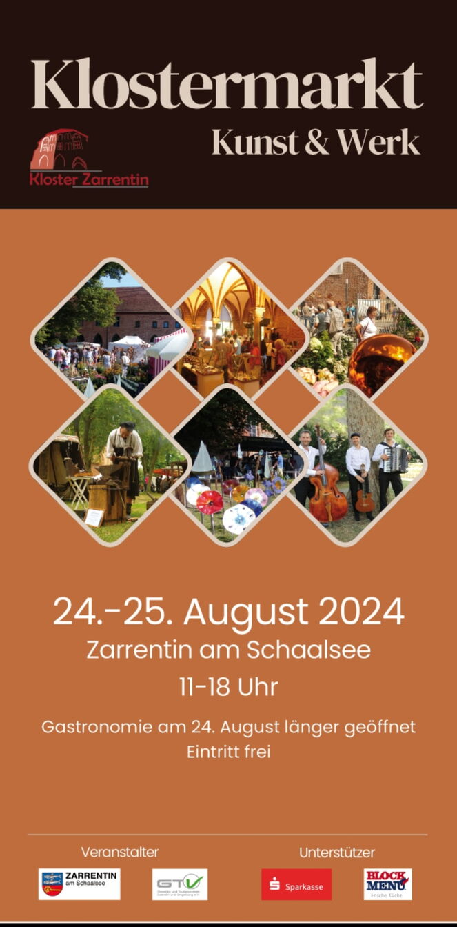 Der Klostermarkt „Kunst & Werk“ wird mit Unterstützung der Freiwilligen Feuerwehr Zarrentin, des Bauhofes Zarrentin, der Mitarbeiterinnen aus der Kulturabteilung der Stadt, der Tagesmütter der Schaalseepiraten und der DLRG Zarrentin umgesetzt. Den Klostermarkt "Kunst & Werk" organisiert der Gewerbeverein Zarrentin und Umgebung e.V. im Auftrag der Stadt Zarrentin am Schaalsee.