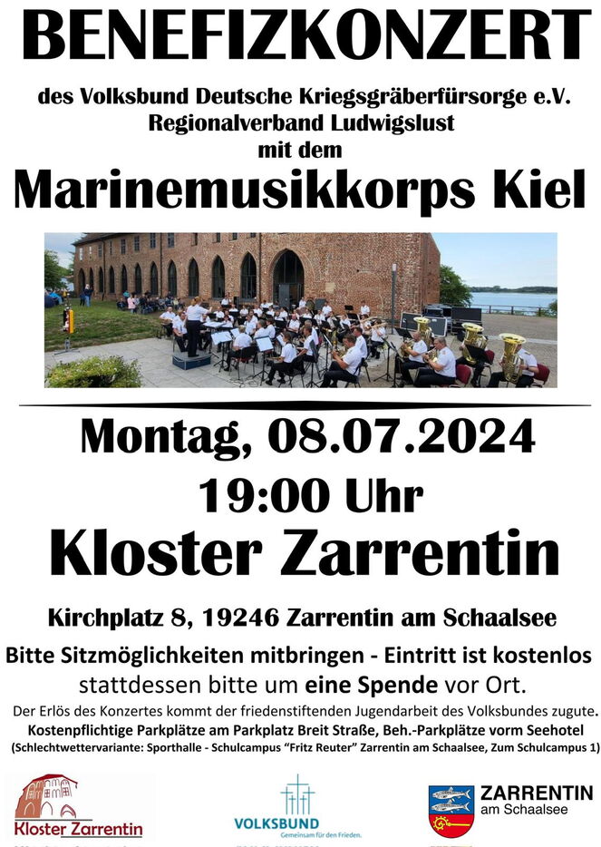 „Nach einem sehr erfolgreichen Konzert im vergangenen Jahr ist es uns als Volksbund-Regionalverband Ludwigslust, nun zum zweiten Mal gelungen das Marinemusikkorps Kiel für ein Benefizkonzert in unsere Region zu holen. Den Klängen des weit über Schleswig-Holstein hinaus bekannten und beliebten Marinemusikkorps auf einem Open-Air-Konzert vor der traumhaften Kulisse am Kloster Zarrentin mit dem herrlichen Blick auf den Schaalsee lauschen zu können, wird auch in diesem Jahr für die Gäste ein unvergessliches Erlebnis werden. Wir danken ganz herzlich Herrn Bürgermeister Klaus Draeger für die Übernahme der Schirmherrschaft über das Benefizkonzert sowie der Stadt Zarrentin für die kostenlose Bereitstellung der Liegenschaften und Frau Niehus sowie den Mitarbeiterinnen und Mitarbeitern des Amtes Zarrentin für ihre engagierte Unterstützung bei der Organisation“, erklärt die Vorsitzende des Volksbundes, Regionalverband Ludwigslust, Dr. Margret Seemann.