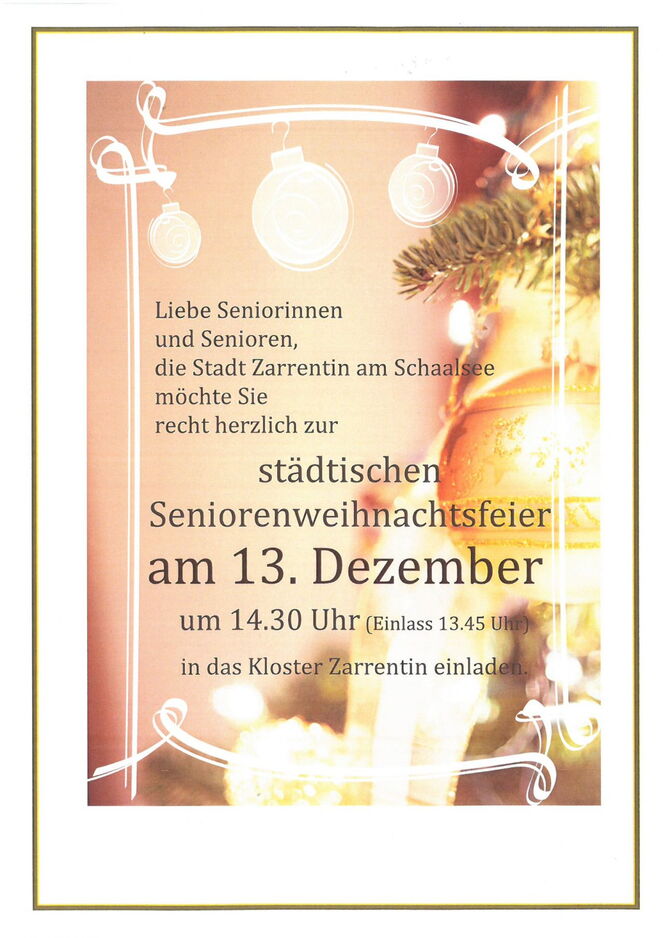 Liebe Seniorinnen und Senioren,die Stadt Zarrentin am Schaalseemöchte Sie recht herzlich zur städtischenSeniorenweihnachtsfeier am 13. Dezember um 14.30 Uhr (Einlass 13.45 Uhr) in das Kloster Zarrentin einladen.
