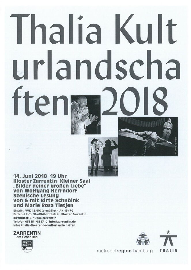 Zarrentin 14. Juni 2018 19.00 UhrKloster Zarrentin Kleiner SaalKirchplatz 8, 19246 Zarrentin am Schaalsee„Bilder deiner großen Liebe“von Wolfgang Herrndorf mit Birte Schnöink und Marie Rosa Tietjen